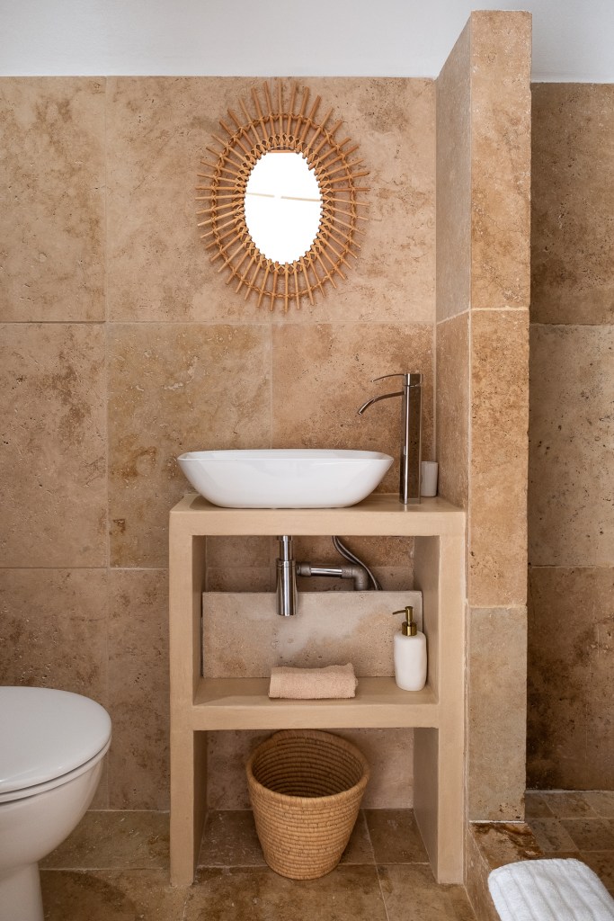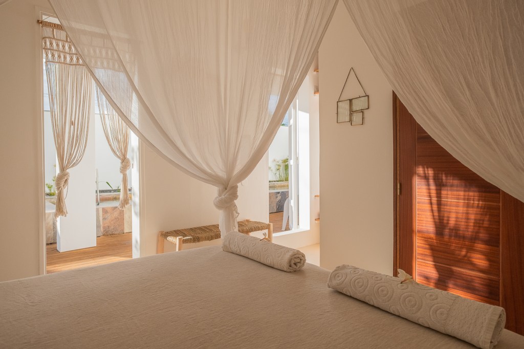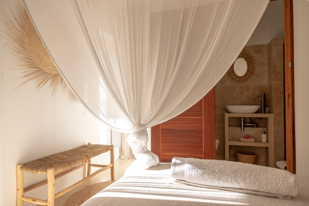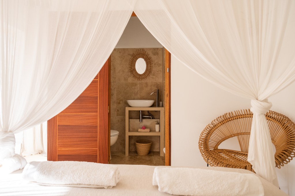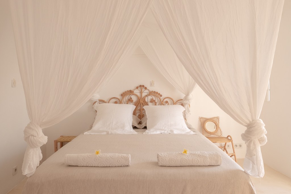Du béton ciré, du bois, du rotin, du beau linge de lit en lin (By Indigo) , dans un camaïeu de Blanc et écru : l’idéal pour vous emmener dans les bras de Morphée !